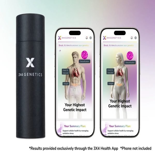 The 3X4 Genetics Test. This is an at-home cheek swab DNA test that helps identify how your unique genetics may influence important areas of health such as heart function, hormones, weight management, blood sugar, inflammation, and nutrient processing. Your results are delivered through the 3X4 Health app, where you receive personalized, science-based insights and lifestyle recommendations designed to help you make more informed decisions about your health.